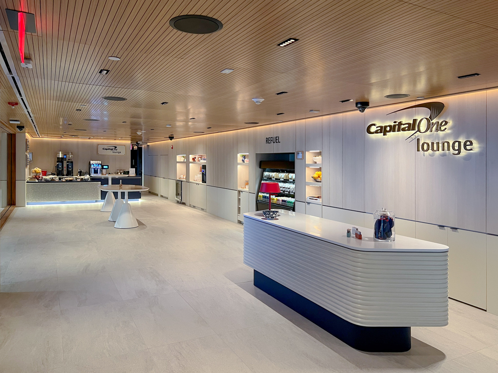 The Capital One Lounge in Washington Dulles International Airport (IAD) is the first fully commercial lounge in any airport in the state of Virginia because all other lounges are airline owned/managed. Additionally, because it is not a restaurant, it did not fit into any of the Virginia Alcohol and Beverage Control (VABC) categories and required political lobbying in order to make a category for this lounge. Since publicly accessible space is at a premium at IAD and there was no space in any of the concourses for a new lounge, the airport allocated an unused space, which was originally a lounge space back in 1962, at the base of the old FAA tower that has been vacant for 15+ years. Planning, designing, and building the lounge encountered several challenges including how to ensure compliance with the Americans with Disabilities Act (ADA). The lounge was set up with stair access only and was at a lower level from the rest of the terminal by 2 feet, requiring the design to account for the difference in elevation and installation of ADA ramps throughout the space. The FAA tower also has a large concrete core as its main structural support, with stair and elevator shafts that had to be worked around. The designer took one of the elevators that was already out of service and converted it into a walk-in refrigerator, while the central core was turned into a kitchen, and the open areas with large windows were maximized for passenger viewing. Other challenges included bringing ventilation up to code. Since the tower is classified as a historical landmark, the State Historical Preservation Organization (SHPO) would not allow grease vents or air handling units on the roof of the structure and therefore the only way to exhaust air was by using horizontal fans with louvers on the exterior of the building. The lounge space opens with a bright entrance and glass curtain wall, with seating to the west as you move to a higher and more inviting open area on your way to the bar and buffet. On the east side, there is a full coffee bar with a barista, 4 unisex restrooms, and a parents room along with a more secluded library area. The finishes are a variety of teak laminate wood covered walls, dark blue tile walls, large format tile floors, and carpet on the raised floor for the bar and library. The ceilings are a combination of teak wood and large format ceiling tiles by Decoustics, in a bright white butterfly pattern. To make the space more comfortable, especially when the sun is low, the exterior glass is outfitted with smart film that can be electronically controlled to become opaque and significantly reduce the glare and intensity of the sunlight. Lastly the furniture selected was reminiscent of mid-century modern styling, which was the design of the original lounge and even included some of the furniture from the original designer of the airport Saarinen(designer) and Bertoia (artist).