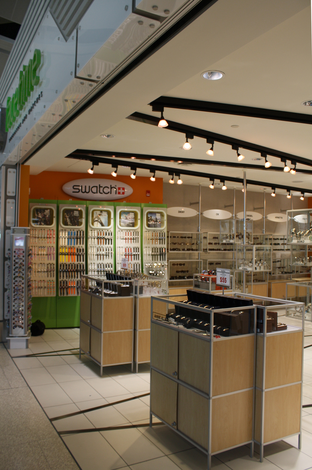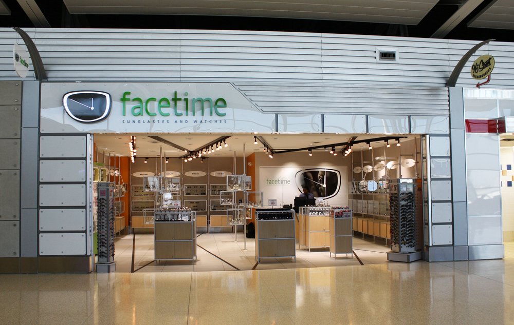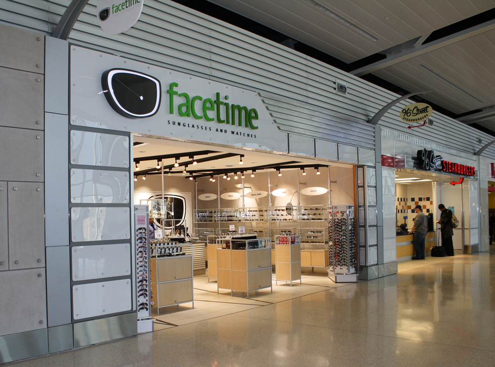 Facetime is an interior architecture project focusing specifically on the retail of both sunglasses and watches. This modern interior features display units and cases that can be modified for the best presention of product. In addition, a pre-designed Swatch display needed to be incorporated into the space. The linear intersecting ceiling lighting pattern is repeated below in the tile flooring. Along with the design of the space, the branding and naming of the store, exterior