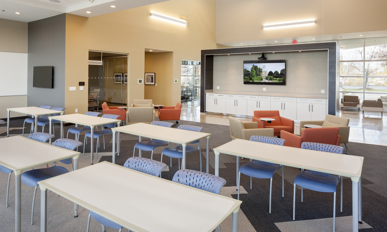 Triangle headquarters underwent a full renovation to update the cubicle office into an open, collaborative work space. The extensive renovation included demolishing multiple walls to make way for open work space desks and an employee synergy meeting space with projector and upgraded technology.