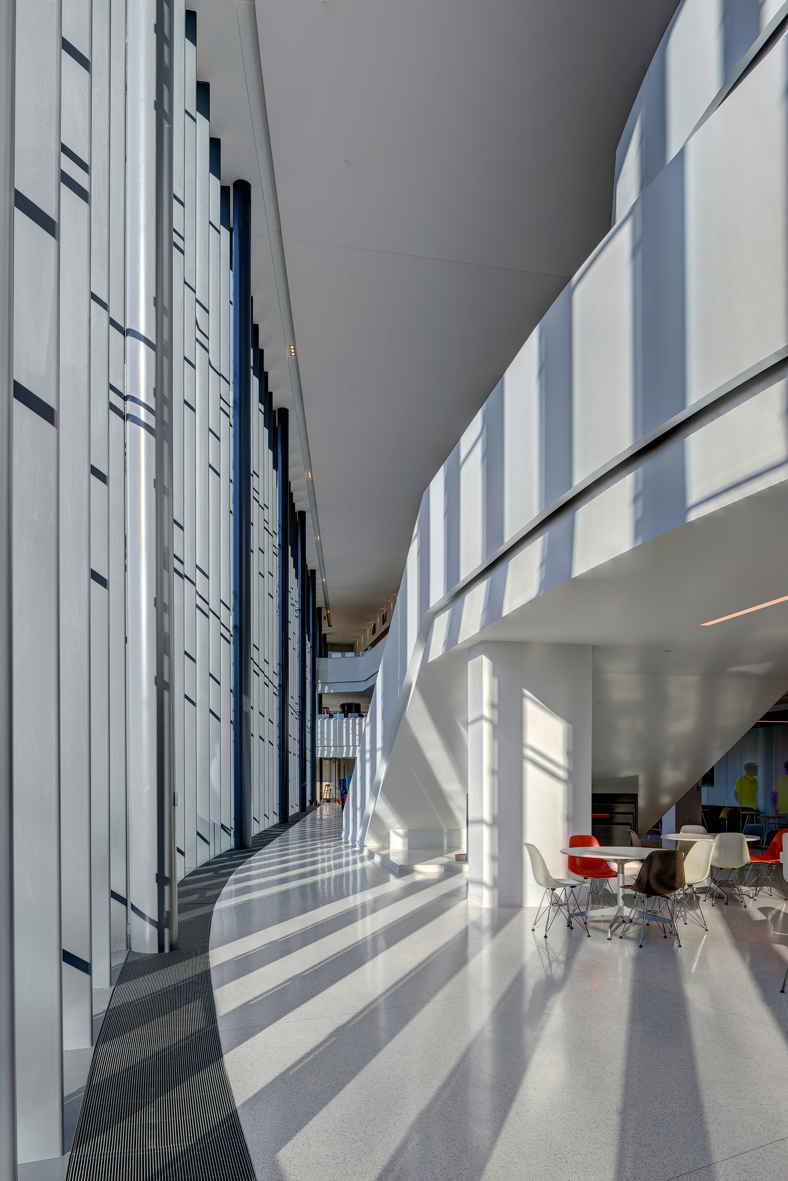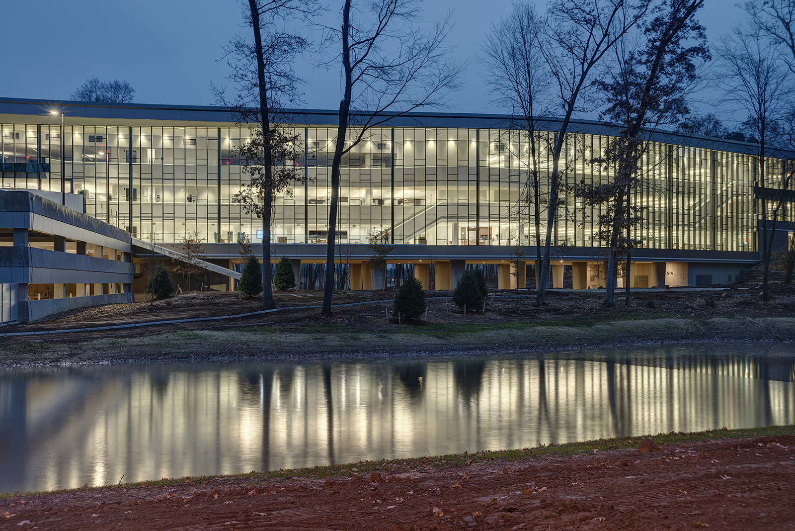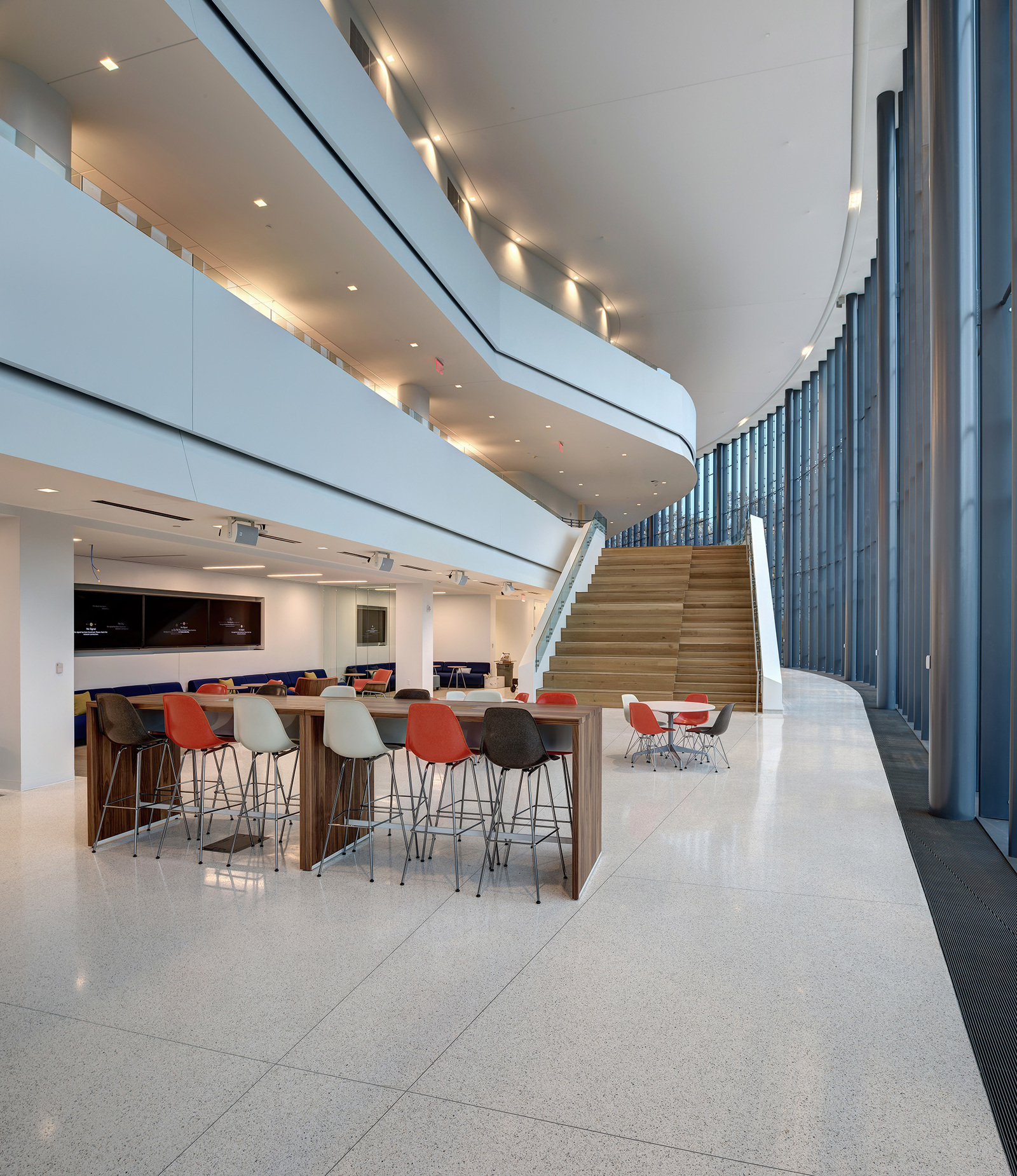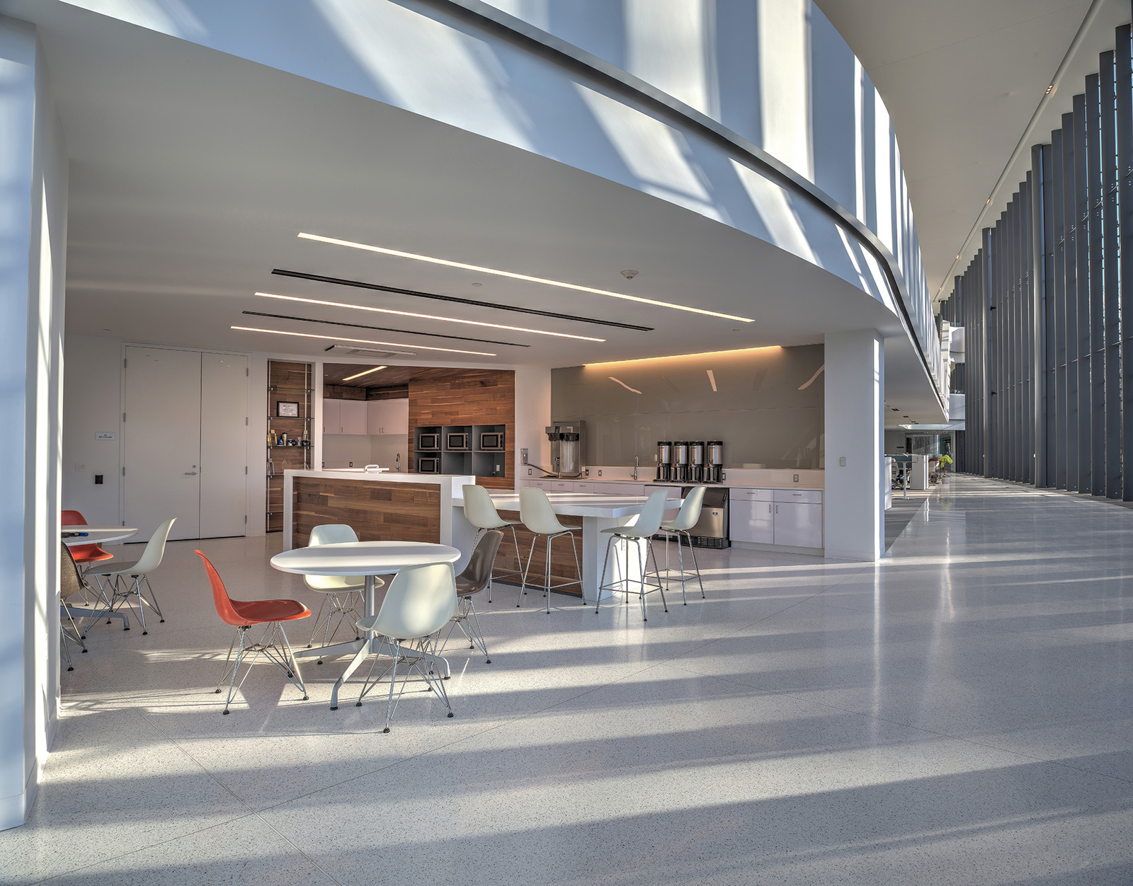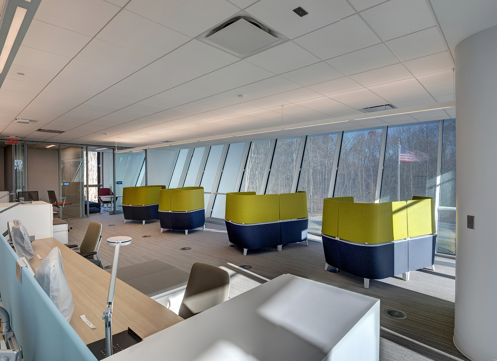 Bouma executed elaborate design details in this state-of-the-art facility. The 92,000-square-foot building houses 150 employees who relocated from four other locations and features various meeting and conference rooms, extra-large cubicles, and work pods as well as a central glass atrium, grand staircase, fitness area, cafeteria and outdoor patio.