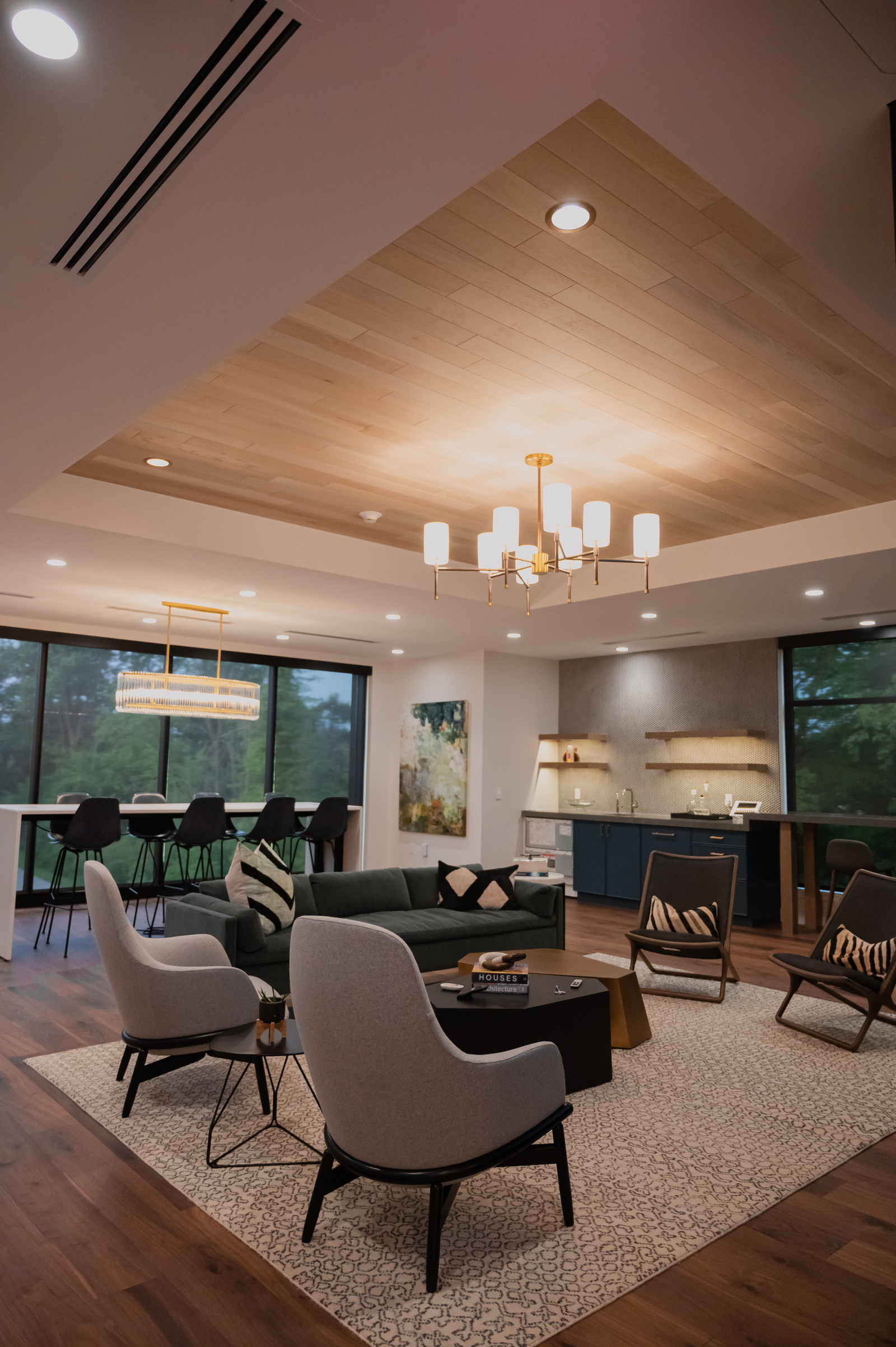 Continuum Ventures contains high-end office space blended with a residential feel. Private offices, conference rooms, custom kitchen, and a lounge area with fireplace all boast a nature-inspired design. Upon entry, guests are greeted by a live wall which features custom 3D walnut wood panels along with technology-rich amenities throughout.