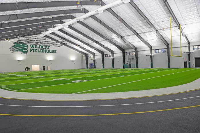 Jenison Athletic Facility is a 64,000 SF sports facility with an indoor turf field, a two-lane track, a multipurpose room, and a cheer room. The pre-engineered metal building had a clear span of 200 feet and a 4:12 roof slope, requiring two cranes to erect the frames.