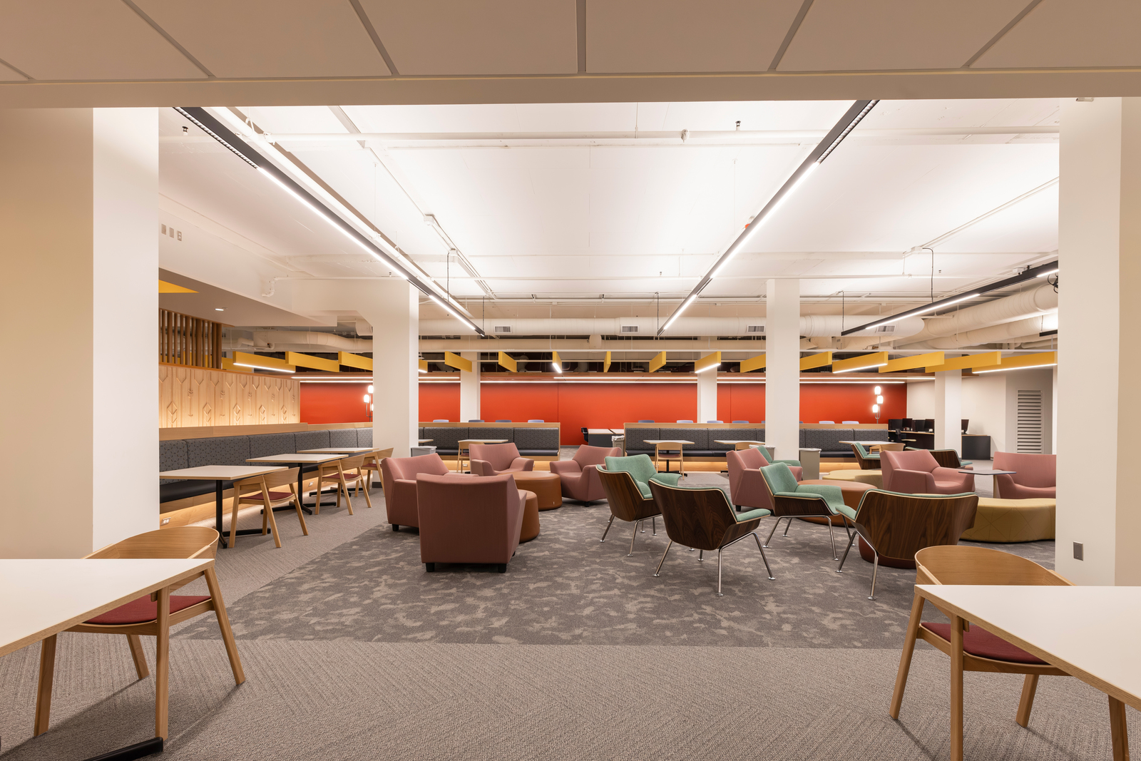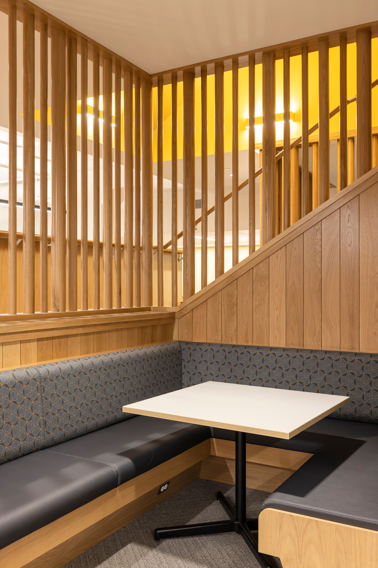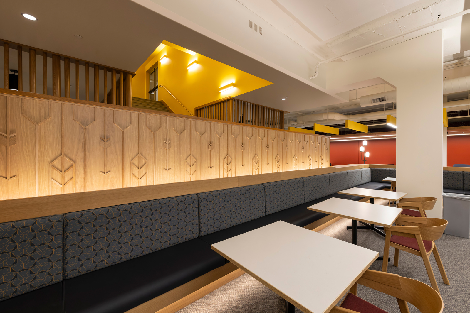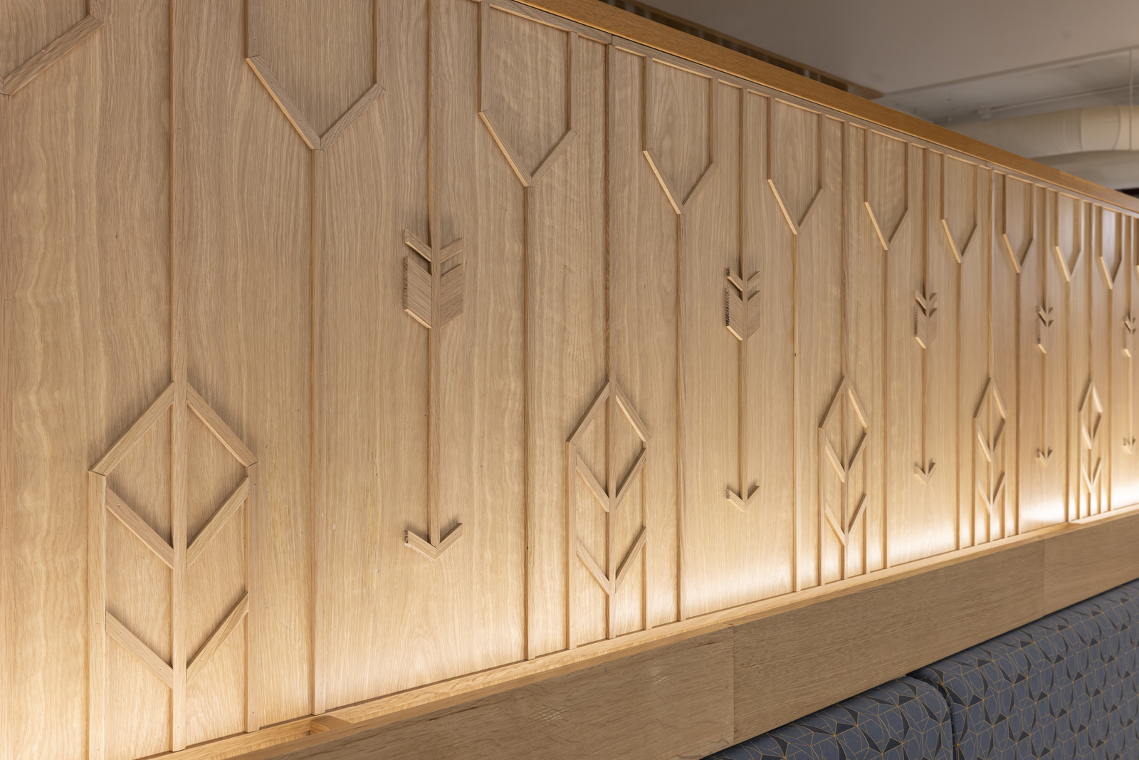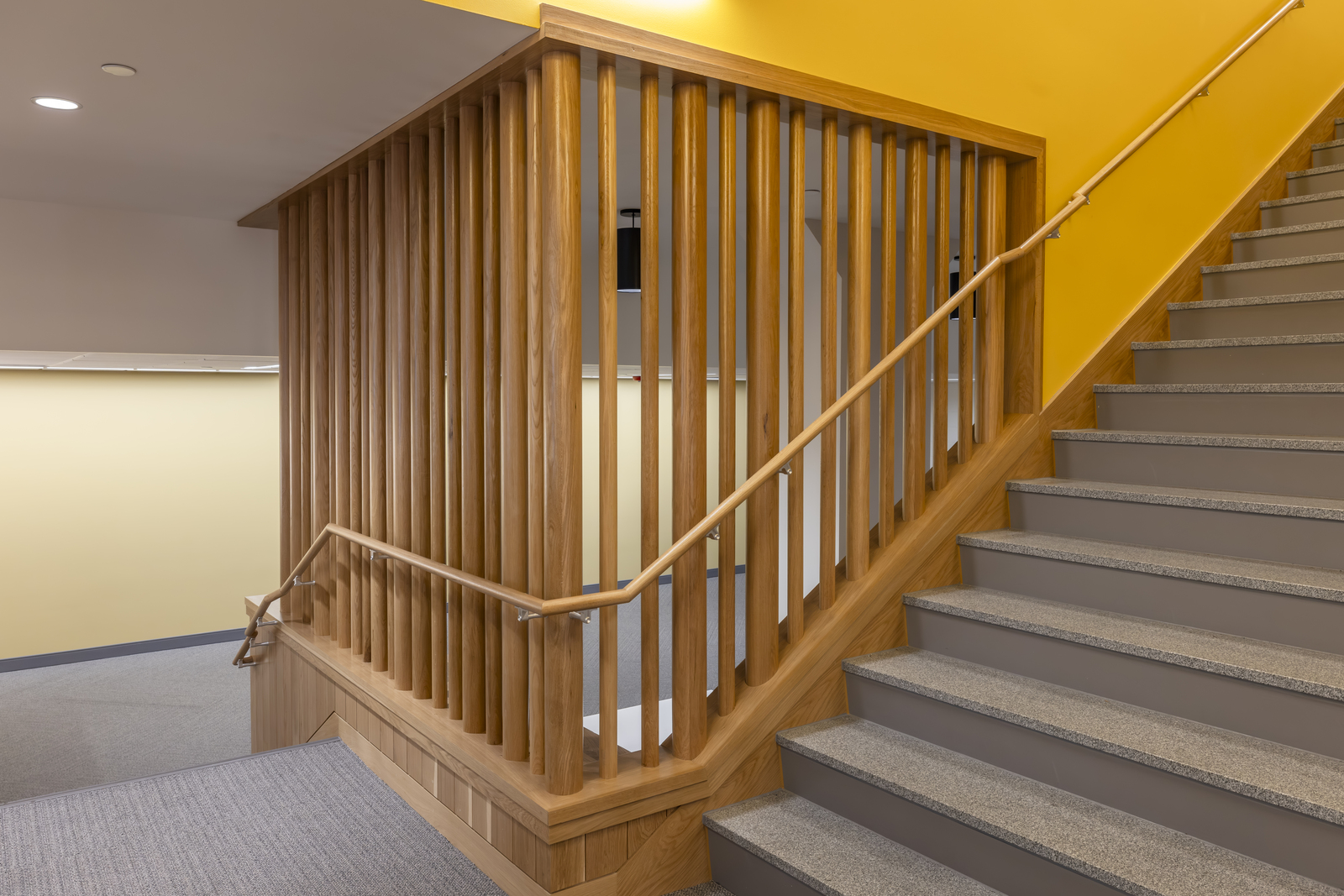 Pioneer’s General Trades team delivered precision-crafted finishes, including hand-shaped oak dowels at the grand stair, Calvin-branded paneling, quartz countertops, and bronze signage. Custom elements were shaped in-house and installed onsite, reflecting attention to detail and seamless coordination with the project’s design intent.