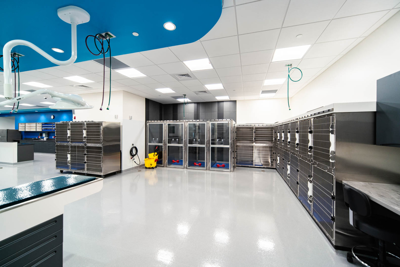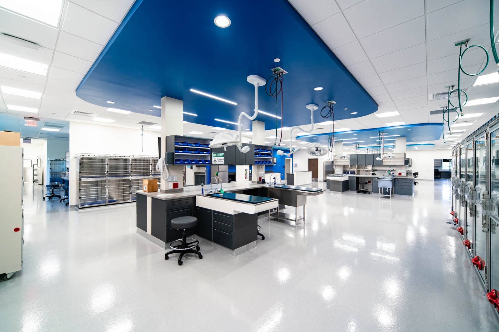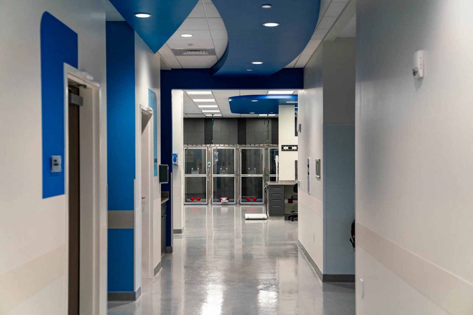 The 25,000 SF building exterior consists of masonry, metal panels, and glass. There is an outside patio for employees to use for lunches and breaks. The interior is designed as a high-end pet care facility. It includes a large waiting and reception area, administrative support areas, a locker room, a breakroom, conference spaces, exam rooms, surgical and operating rooms, procedure rooms, a CT scan, and an MRI room. The project was completed within the 10-month schedule and stayed on budget. All construction was completed to achieve high-end pet care needs, including epoxy floors throughout much of the space for cleanability, durable Midmark cabinets with solid surface countertops, overhead surgical light fixtures as needed, and medical gas and vacuum systems throughout the space to meet procedural and operating needs. The project was constructed over the winter months, so temporary heat was needed to provide a workable construction environment. Regular quality meetings and inspections were performed by the FCI team to ensure the project was built according to plans and specifications.