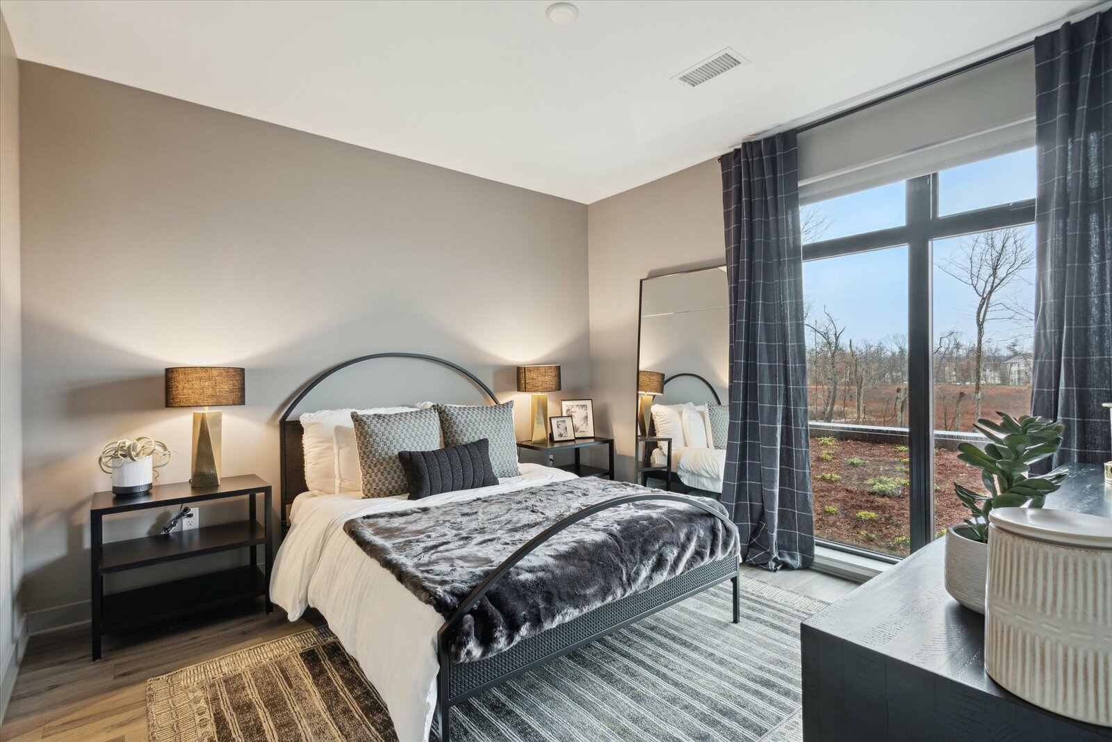 A unit main bedromm with floor to ceiling view at Tall Timbers