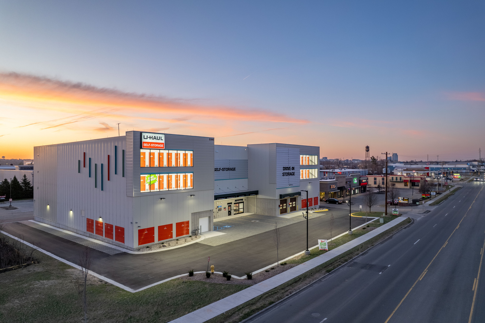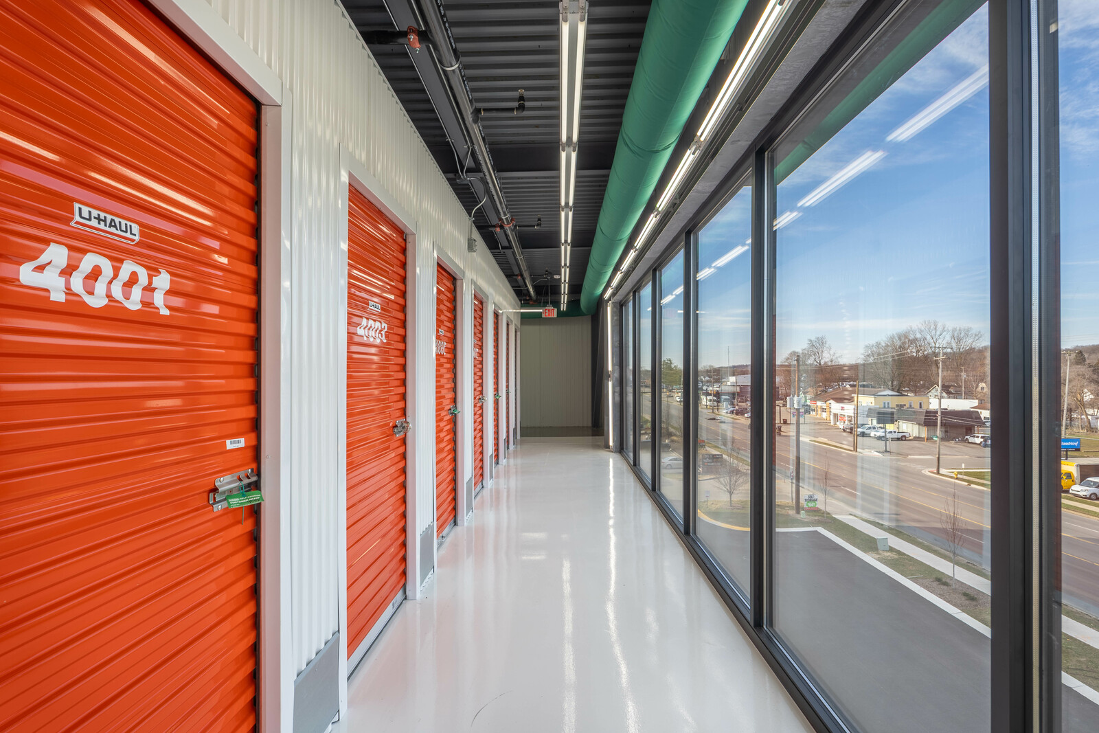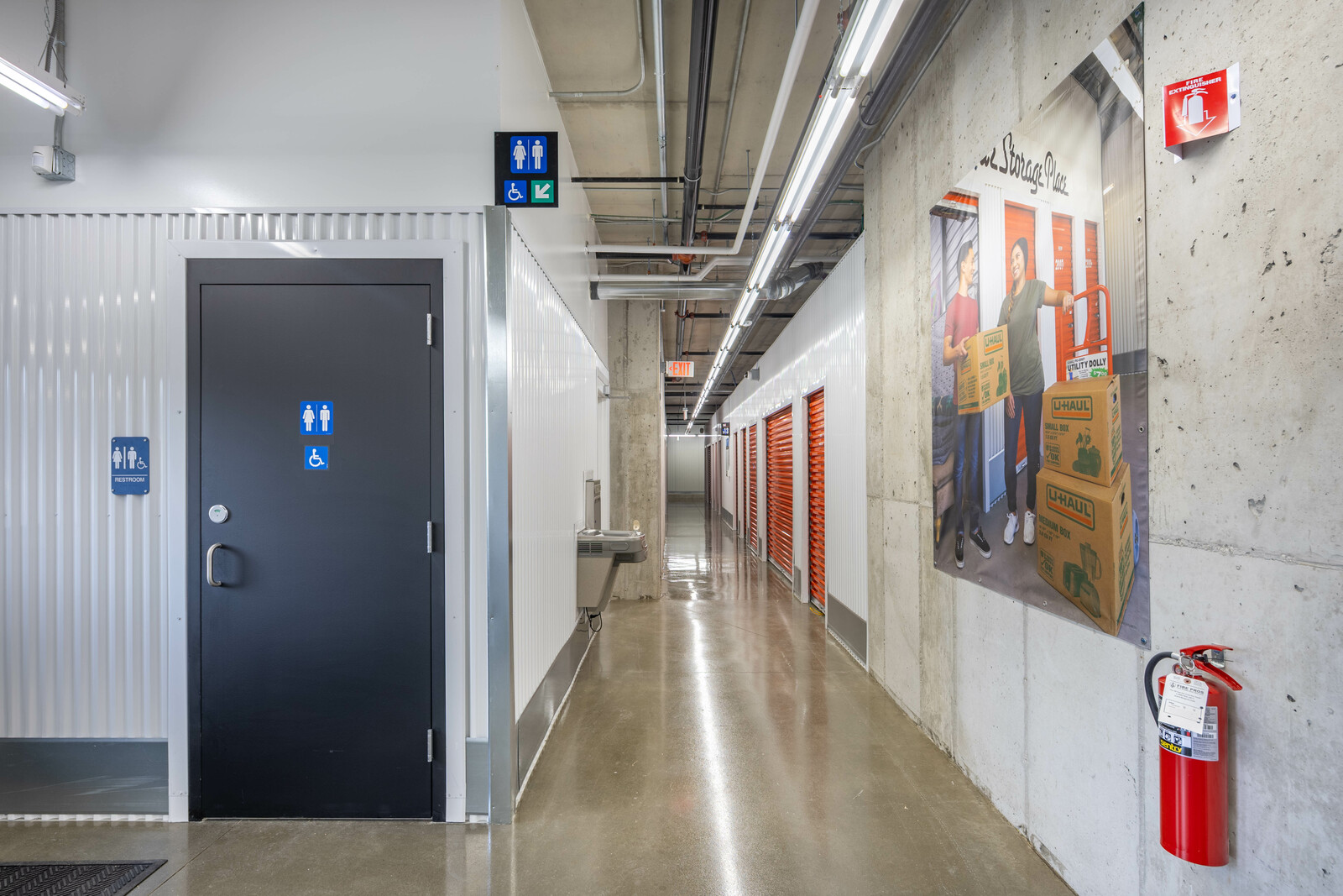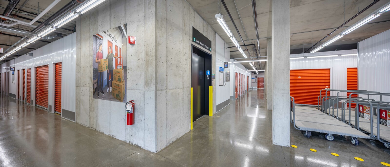 The three-story new U-Haul Moving & Storage on Alpine Ave. includes a packing bay, daylit hallway with storage units, elevator lift, supply retail center, and bright orange accents as part U-Haul's inviting branding.