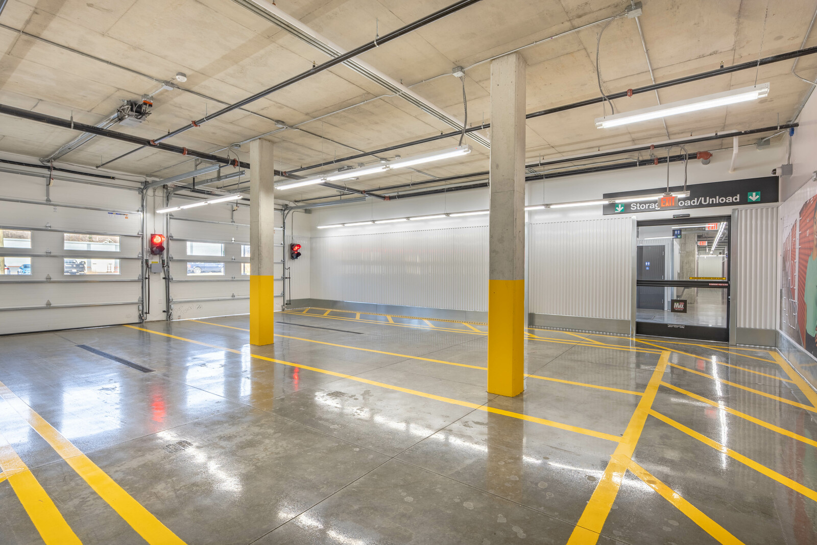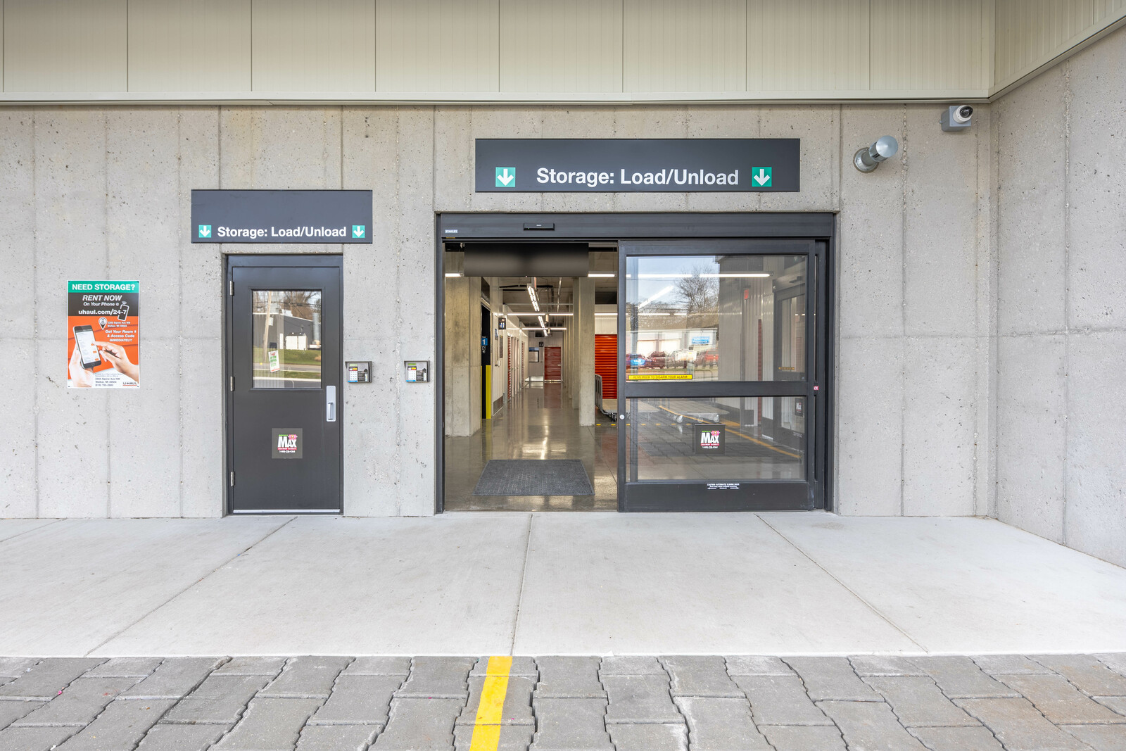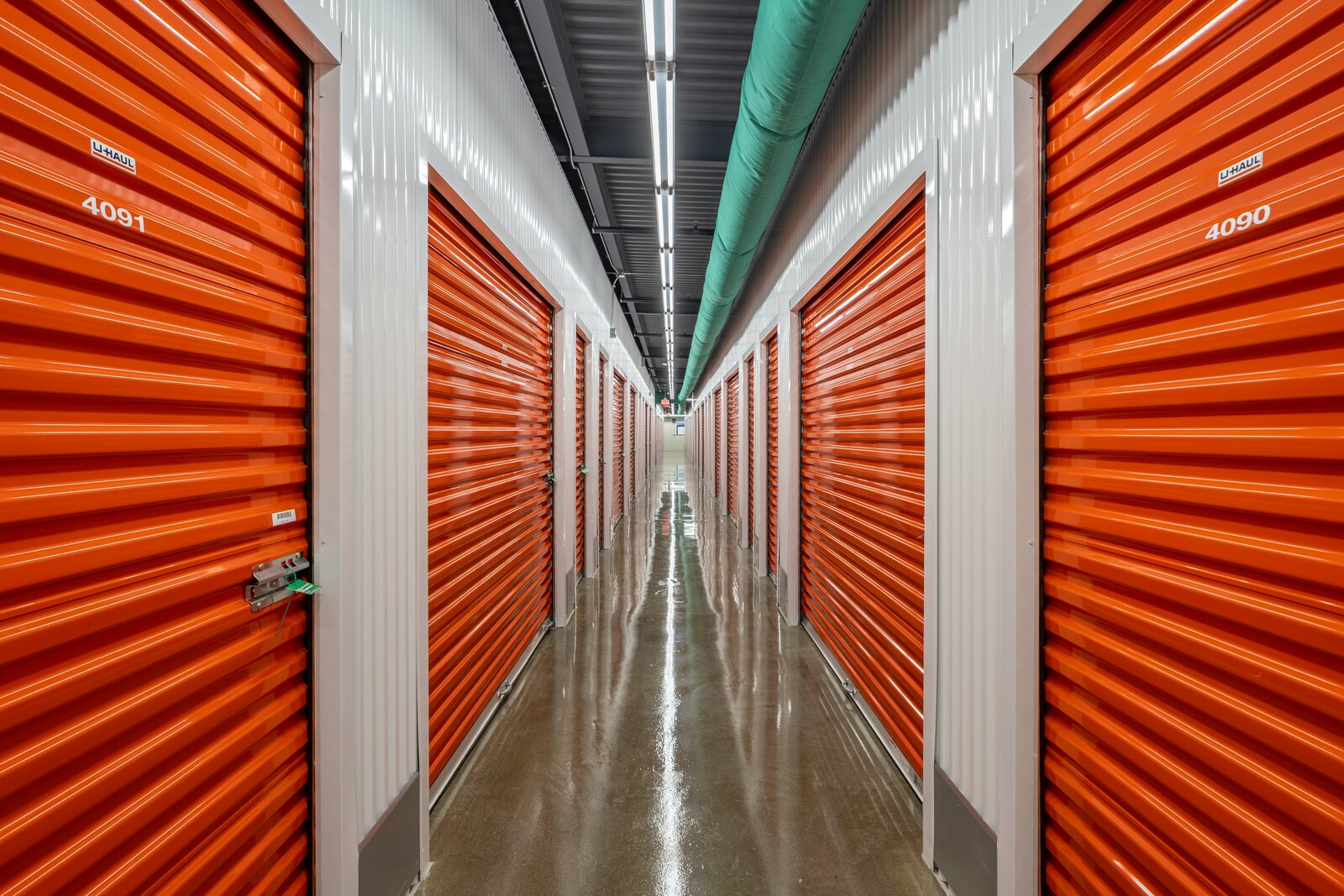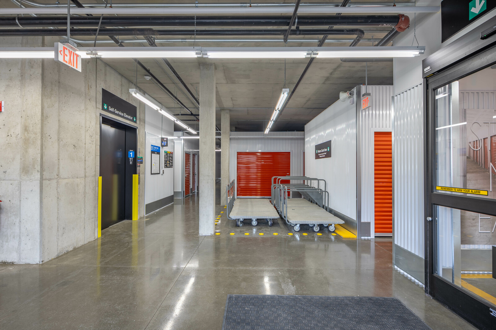 The three-story new U-Haul Moving & Storage on Alpine Ave. includes a packing bay, daylit hallway with storage units, elevator lift, supply retail center, and bright orange accents as part U-Haul's inviting branding.