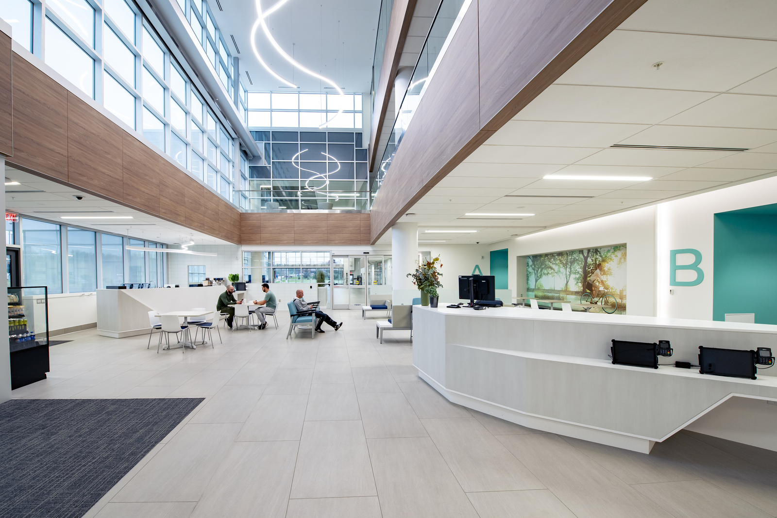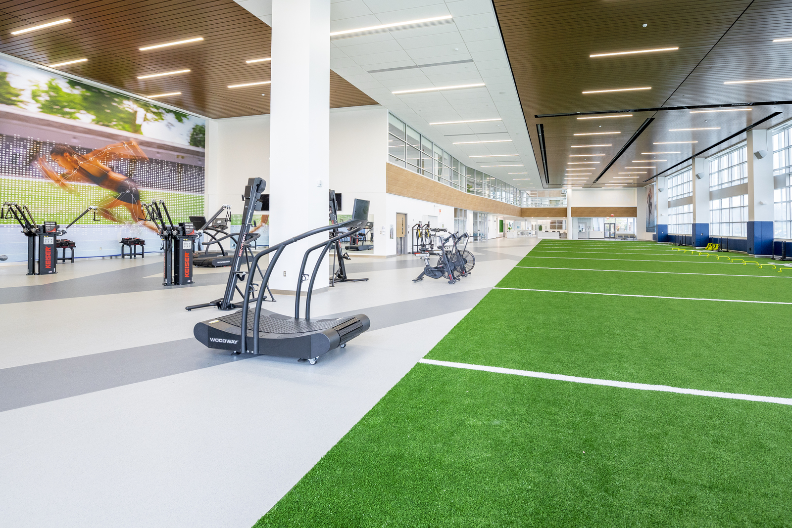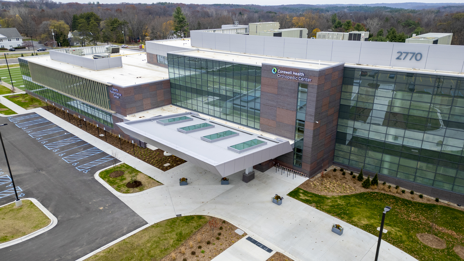 Corewell Health — Orthopedic Surgery on the East Beltline campus combines sports and fitness, surgical, and clinical facilities. This 116,000 SF building required extensive site work for stormwater management. Key features include five operating rooms, three procedure rooms, and an indoor/outdoor athletic field, connected via a two-story walkway.
