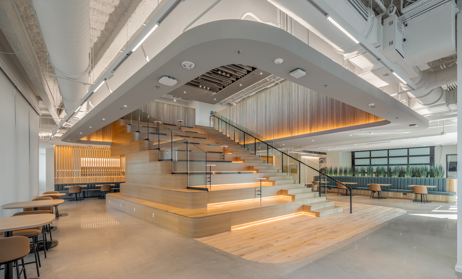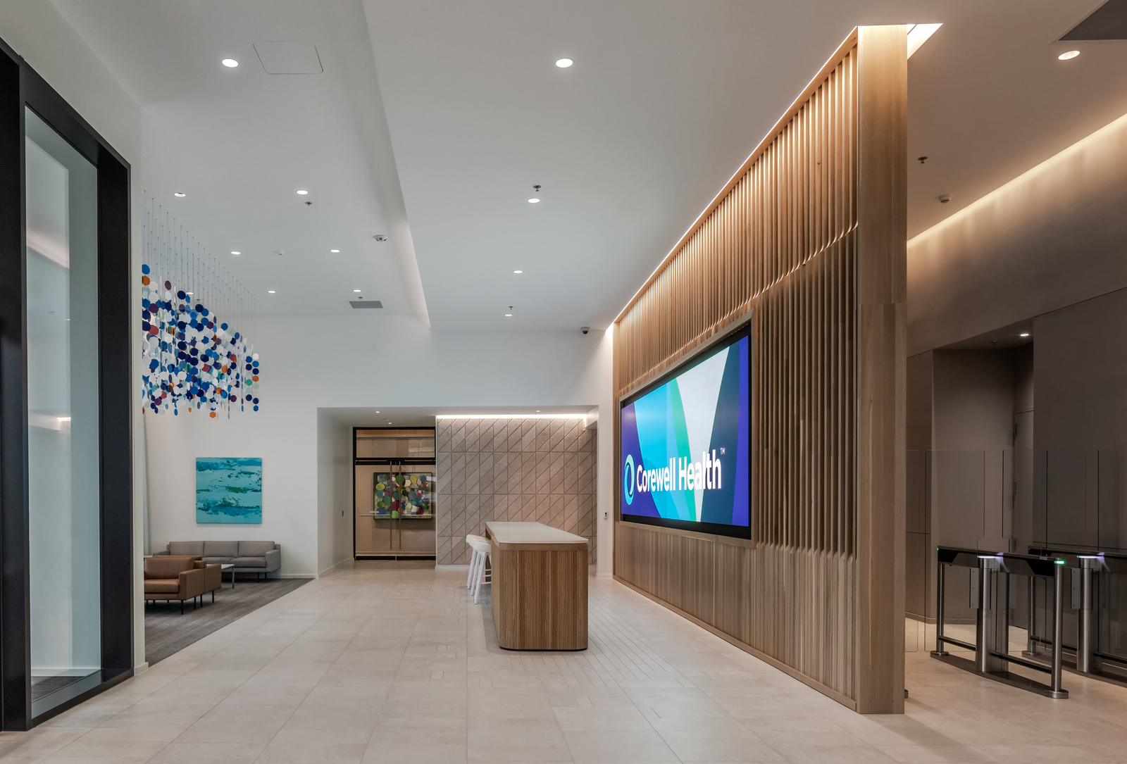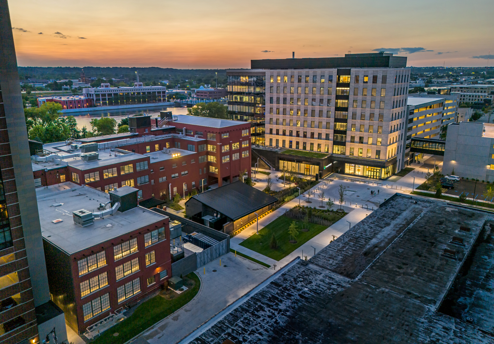 Corewell Health Place combines shared services into a single hub for health and wellness. The new eight-story office building features a two-level connector bridge to a renovated four-story office building, as well as two new parking structures and a pavilion space.