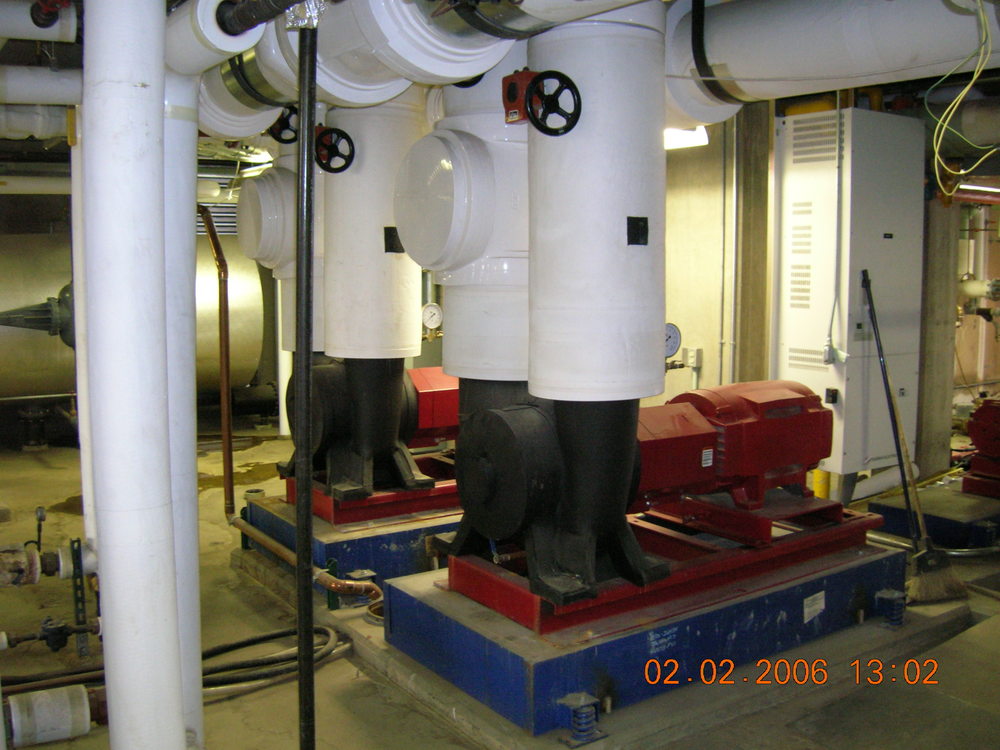 In the fall of 2004 the chilled water system in the hospital Boiler House was removed and had to be reinstalled and operational before the spring 2005 cooling season. The new system included "upsizing" all of the piping and equipment for additional capacity to serve the new expansions. This included a new cooling tower and 500-ton capacity chiller.