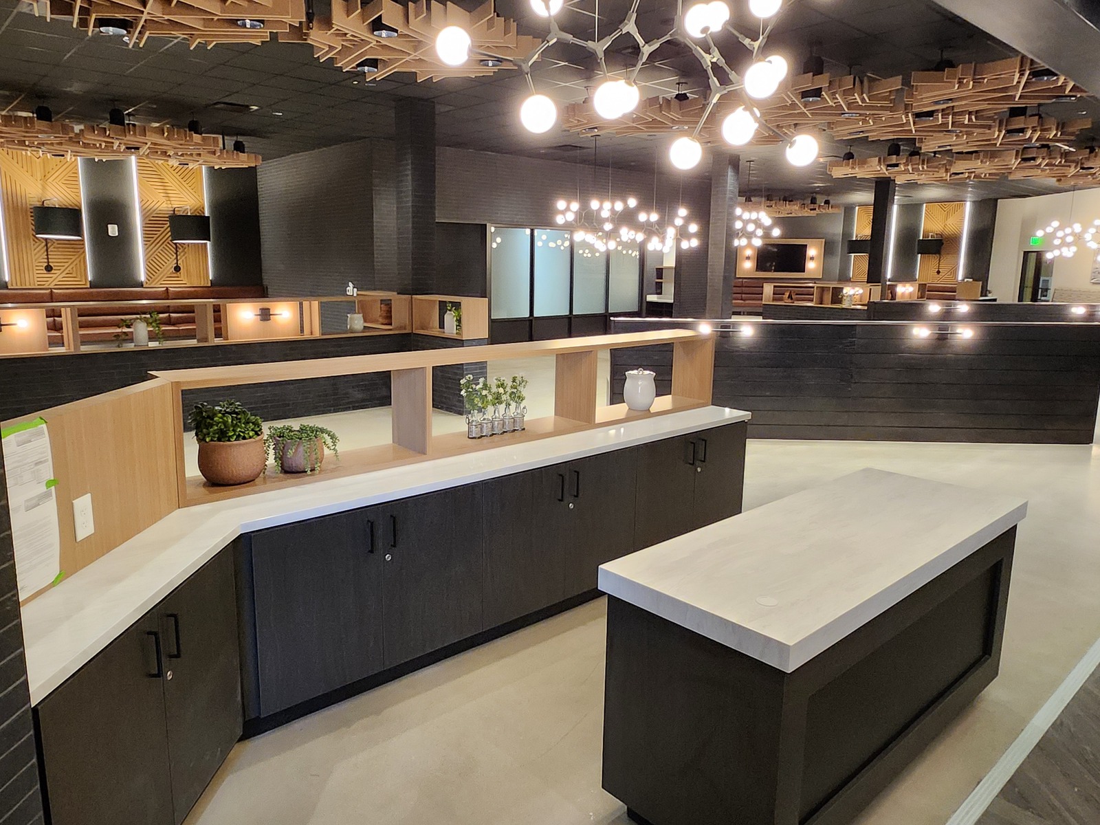 Strata Design was proud to serve as the millwork subcontractor for the remodel of NIIJII, a restaurant located inside the Grand Traverse Resort & Spa in Acme, Michigan. The project featured custom laminate millwork, quartz countertops, wall panels, a reception desk, and privacy screens.