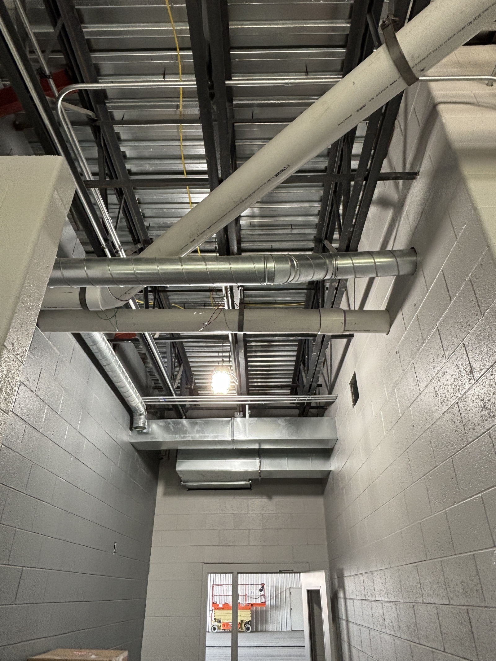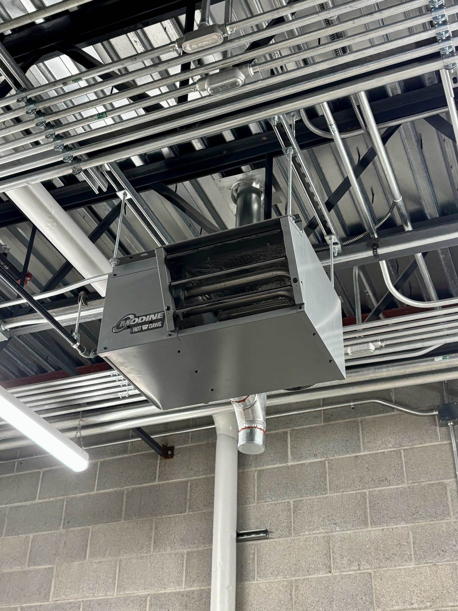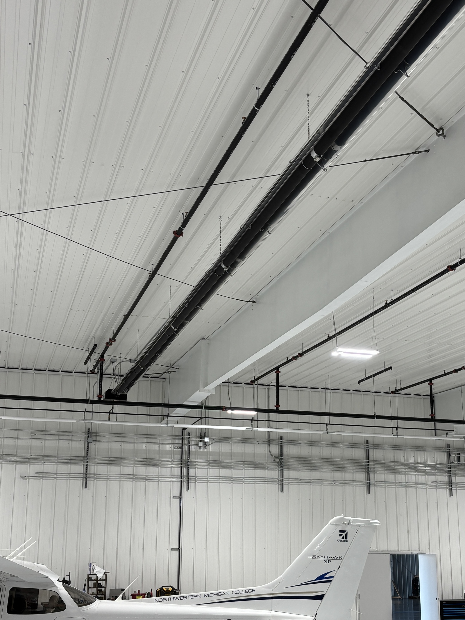 The Northwestern Michigan College Aviation Hangar expansion was a milestone project designed to support the college’s mission of training future aviation professionals. The HVAC scope delivered innovative and highly efficient systems tailored to the unique demands of an active hangar space. From underground BlueDuct designed for durability and air quality, to a 10,000 CFM make-up air unit, advanced exhaust systems, infrared tube heating, and large-scale circulation fans, every component was engineered to provide comfort, safety, and reliability. The installation reflects not only technical expertise but also the adaptability required to overcome equipment delays and site challenges, ensuring a state-of-the-art environment for aviation education.