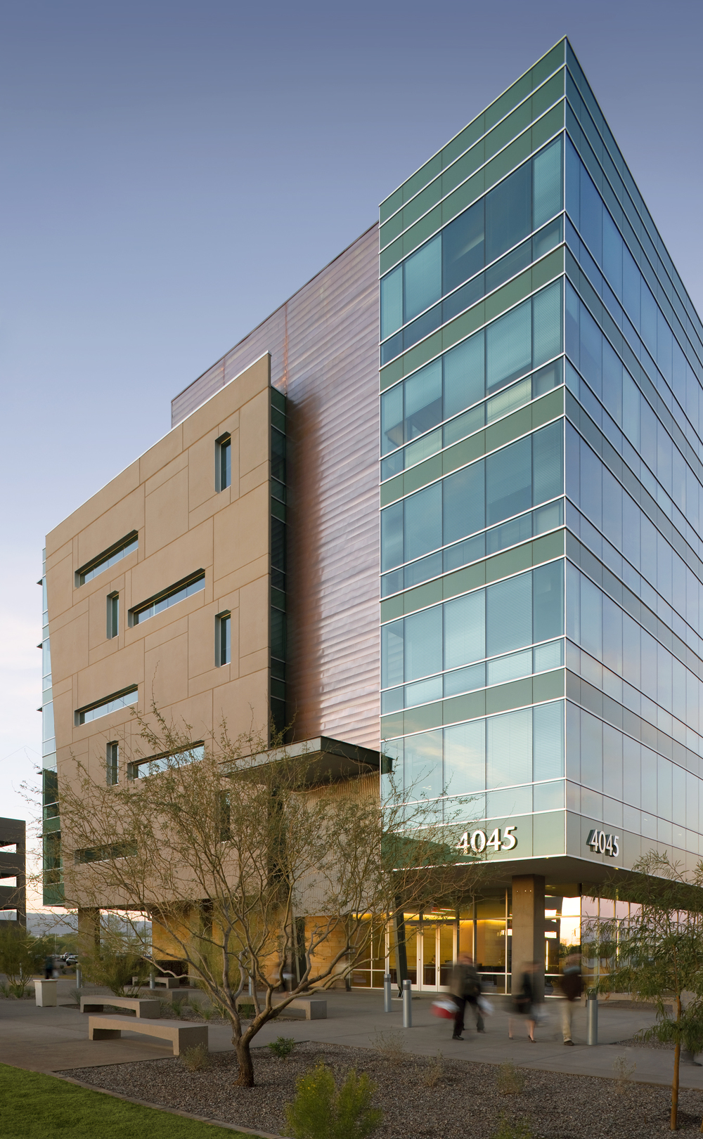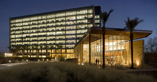 Riverpoint Center is located at I-10 & 32nd Street in Phoenix, Arizona. The University of Phoenix, on-line campus and corporate headquarters building design was meant to be uniquely regional in the response to the desert southwest incorporating natural materials of stone, copper, glass, concrete and steel. The goal was to control the sun and maximize the daylight back into the building. The buildings were elongated along the east/west axis maximizing the north and south exposures, providing natural daylight into the open office spaces to help reduce energy consumption and provide for a healthier work environment. Each building façade was designed to respond to its own exposure: shading on the west and east side is provided by narrow, deep set windows; horizontal metal shade fins were utilized on the southern exposure to control the harsh southern light. An under floor air distribution system was utilized to allow for better environmental control of each work space while reducing energy costs. Indirect lighting was utilized throughout the open office system creating a better working environment. This system reduces glare, is cost efficient and reduces the number of light fixtures required. Water was introduced at the lower level exterior dining area in combination with groves of trees to create a cooler microclimate and to help mitigate the adjacent freeway noise. The Apollo Group is a technology driven company and the design of these buildings reflect this technology.