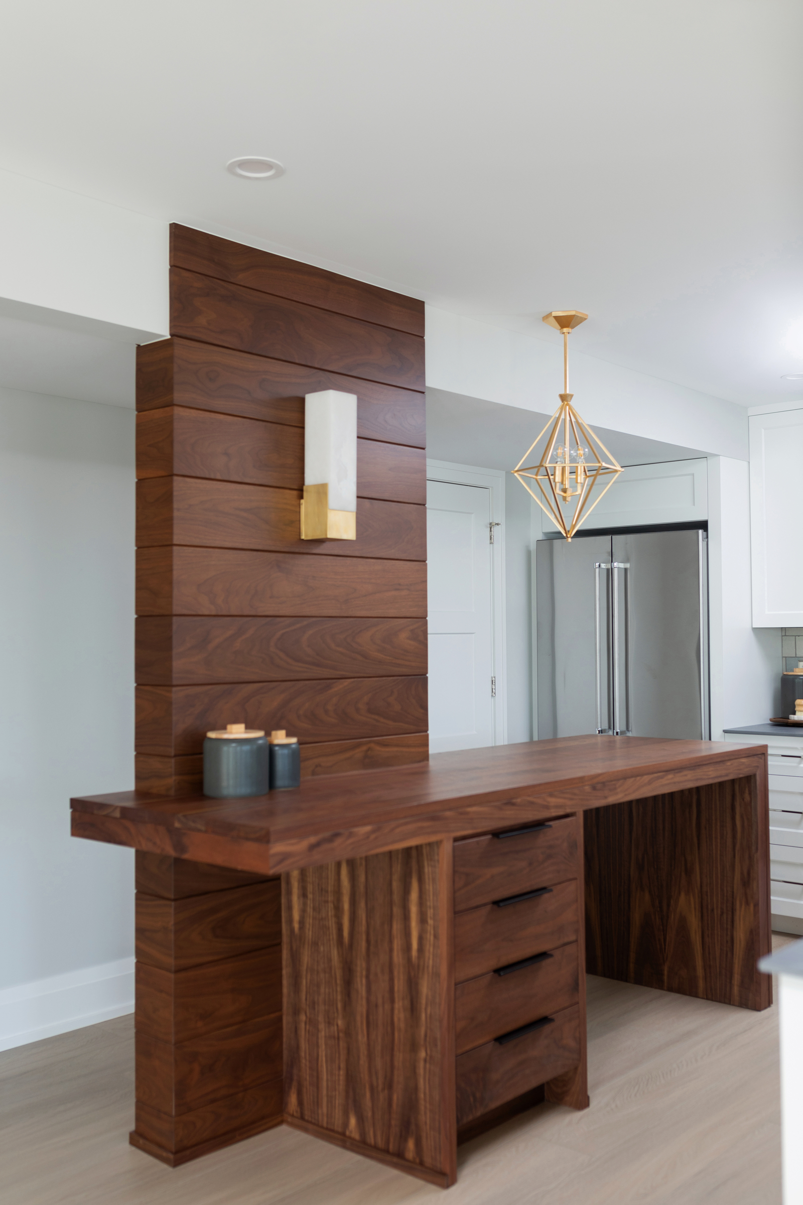 This was a renovation of an existing Kitchen of a Lake Macatawa condo. While we kept the Kitchen in the existing location, we opened up the space with a new layout, including new cabinetry, porcelain countertops, plumbing fixures, and a custom tiled hood. A custom walnut island with walnut paneled wall are the focal point of the Kitchen. The lighting and new LVP floors were installed through the area as well. The last two images show the "existing" space.