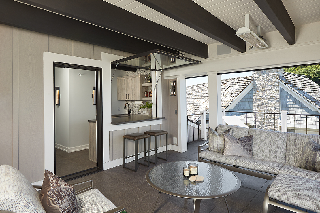 The Glendalough showcases simple but edgy design aspects blended with a transitional presentation in a historical cottage development setting. The Glendalough Lake Home was designed and built for a couple just new to their retirement years. Holland MI was the end of their search for a retirement destination in a lakeside infill development within a historic resort area. The small cluster lots led to some interesting design/construction challenges. Creating 3600+ Sq.Ft of lake home vertically instead of horizontally led to creative uses of materials to adhere within setbacks and height encroachments. Blending modern materials with hints of yesteryear cottage construction aspects took some forethought but with two great clients to work with, both interior and exterior designers on board, and our ample construction team we were able to mesh the two seamlessly. Probably one of the most talked-about and soothing spaces to relax is the 4th floor covered patio. The views at this level are incredible. The motorized screens, the tile floor, the countertop bar with awning window, and heaters provide this space with every need for every event mother nature sends. The entire home was constructed with aging in place design as it is zero-step from the garage entry to every floor via the elevator as well as all the shower spaces. Pictures attest the success