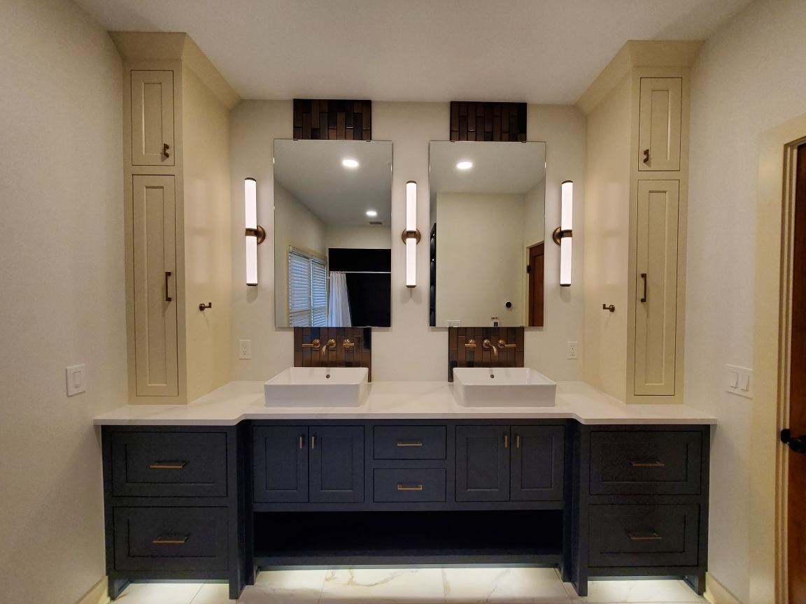 The modern design objectives were met with the unique tile selection in this master bathroom remodel. The copper hex and linear backsplash tile was carefully selected to truly make the space exemplary while also maintaining the reputation of the rest of the home. The floating ceiling in the shower was carefully crafted by the design team to bring ambient light to the shower while also contrasting the dark wall tile with a bright ceiling. Mood lighting is incorporated beneath the double sink vanity, the back of the niche and inside the inset linen shelving to provide light during nighttime bathroom visits without startling you awake.