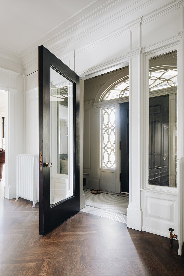 Foyer: The original vestibule floor tile was restored and kept. Damaged millwork was removed and filled in. New herringbone wood floors were installed in the foyer. The staircase looks historical, but it completely brand new and extends three floors up. New wall and stair paneling were designed and added.