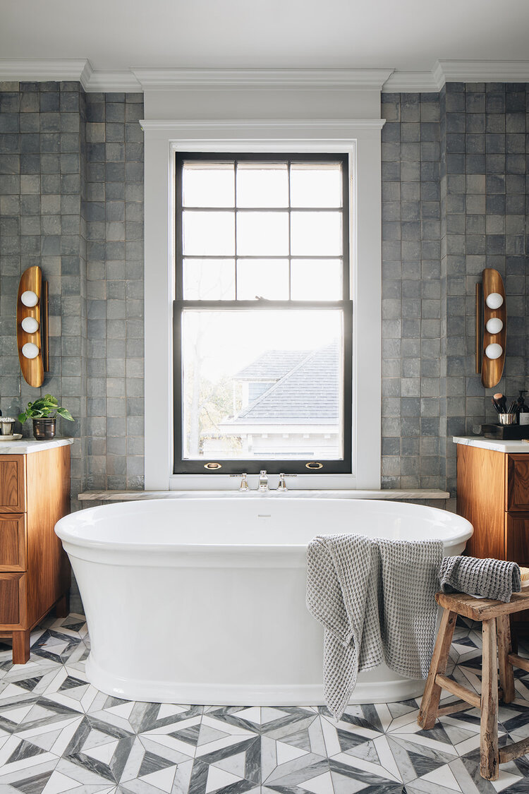 Master Bathroom: New custom tile steam shower with rainfall and body sprays, a custom hand laid tile floor to create the shown pattern, custom vanities flanking a new free-standing bathtub. A water closet and custom coffee bar with prep sink lead to the rest of the bathroom. Not shown is a walk-in closet re-using existing restored cabinetry that is off the bathroom.