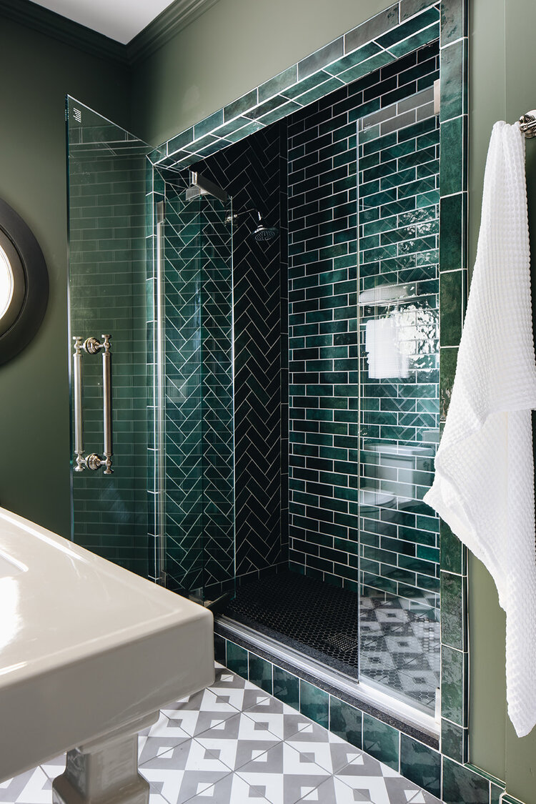 "Green" Hallway Bathroom: This is the hallway bathroom that is a new space showcasing green herringbone tilework.