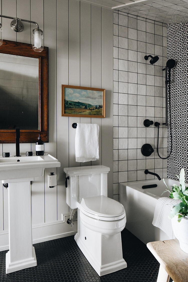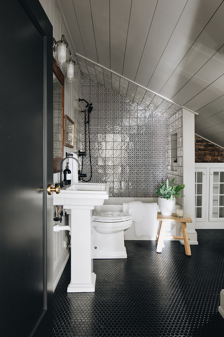 Attic Bathroom #1: An unique layout due to a small footprint and sloped ceiling made for an interesting remodel. We removed the mural and installed a tiled bathtub area, historic millwork and vertical paneling create a more historical look