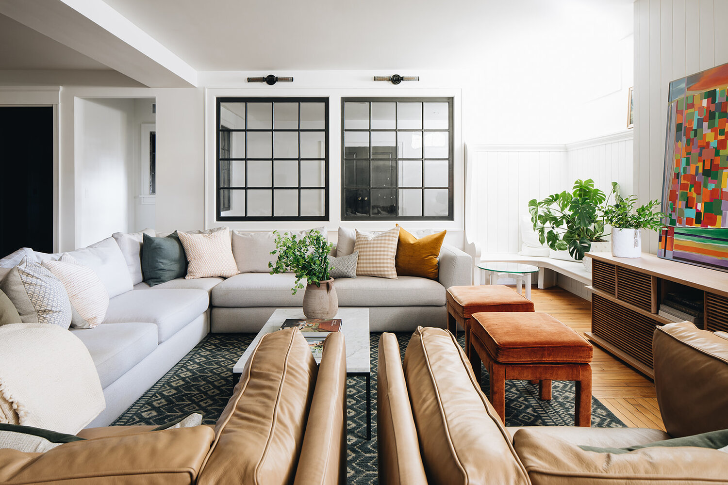 Living Room: Like the Dining Room, the original millwork and fireplace was restored. We repurposed exterior (restored) windows and incorporated them into this room to let in natural light from adjacent rooms.
