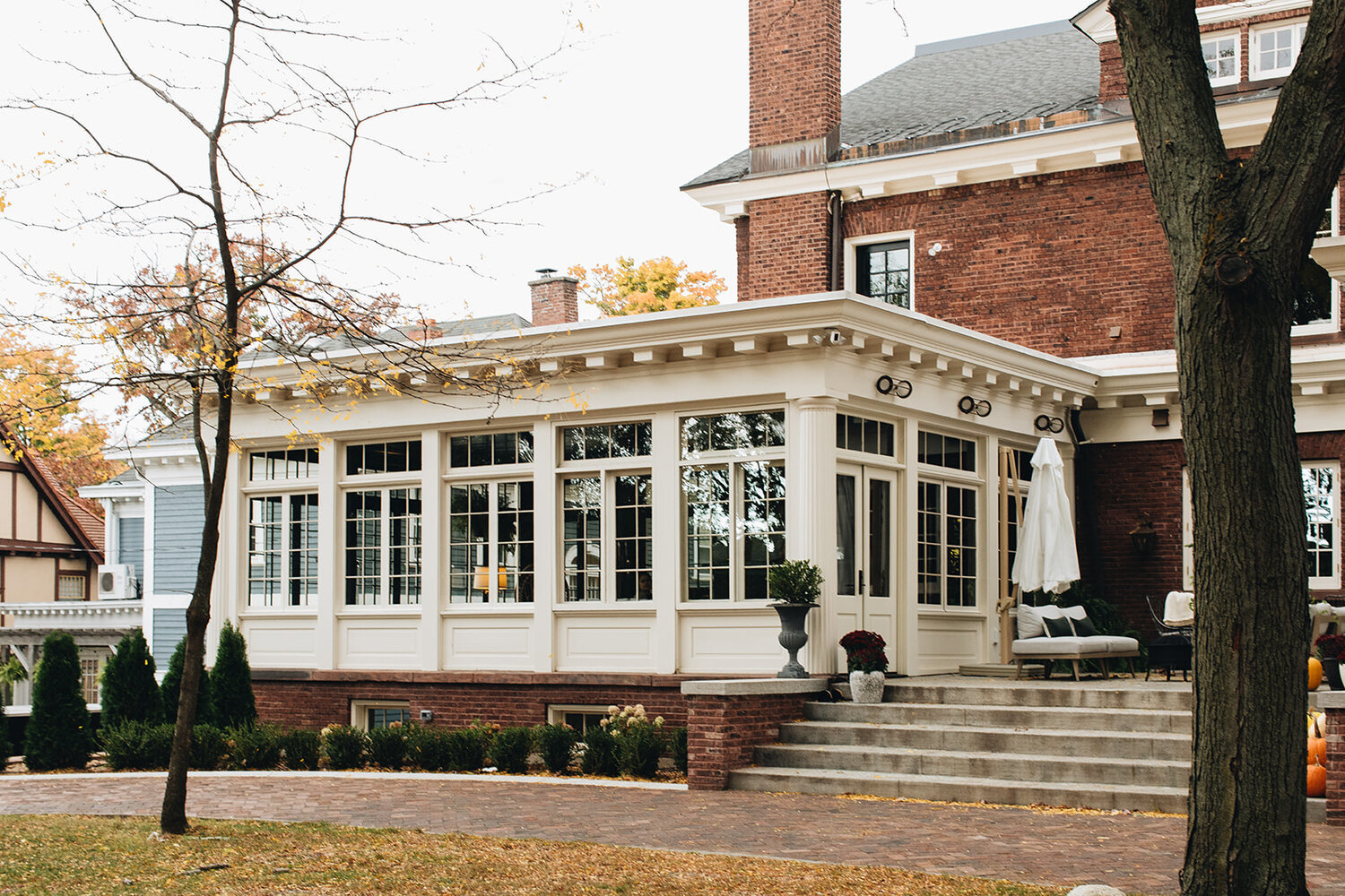 Sun Porch: 840 panes of glass, 42 individual sashes were pulled out, restored and replaced in this porch alone. We restored all of the radiators to working order in the house, restored the paneling, and brought the fireplace back to working order. New checkerboard marble floors were installed. New lighting and millwork finished off the space.