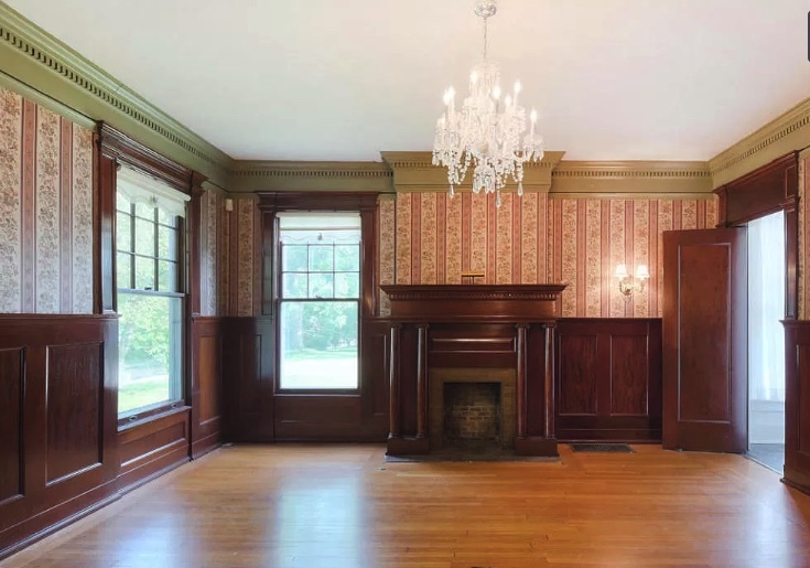 Dining Room: The original millwork, built-ins, and fireplace were restored. New lighting and wallpaper updates the space. The original butler's call button in the floor was kept as a reminder of the history of the home.