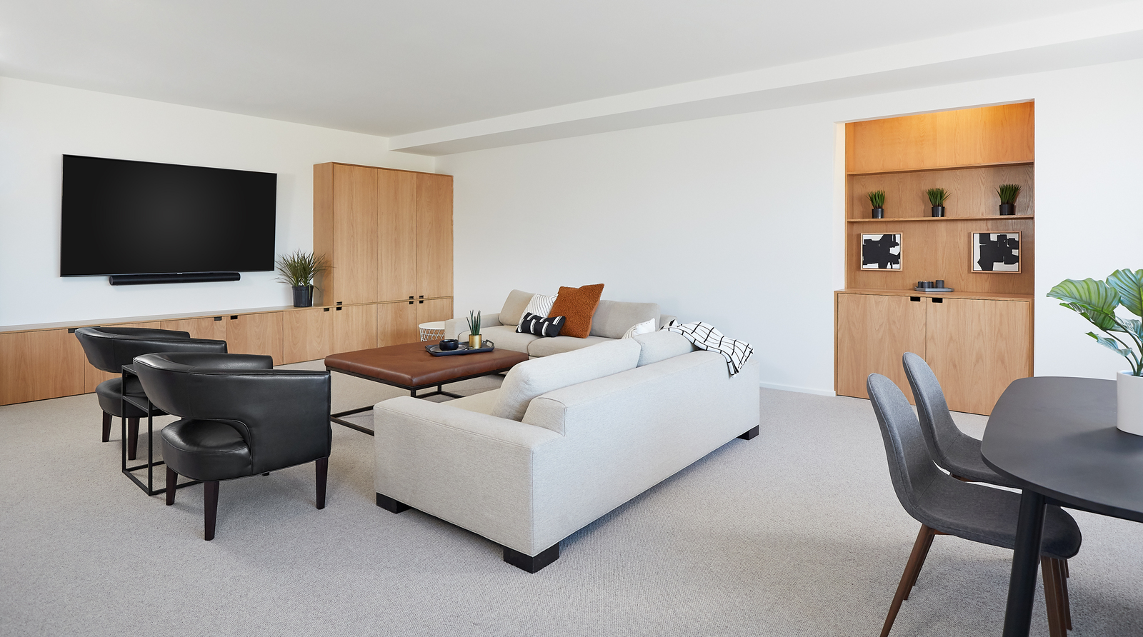 To accentuate the views and reduce distraction the interior design uses a monochromatic palette, minimal trim, and subtle finishes. Attention to efficiency and convenience is evident throughout with the latest in home automation technology including wireless lighting and blind controls, smart thermostats, hidden ceiling speakers, and whole-house audio. Each barn has its own dedicated tankless water heater, high-efficiency HVAC system as well as an ERV for continuous fresh air.