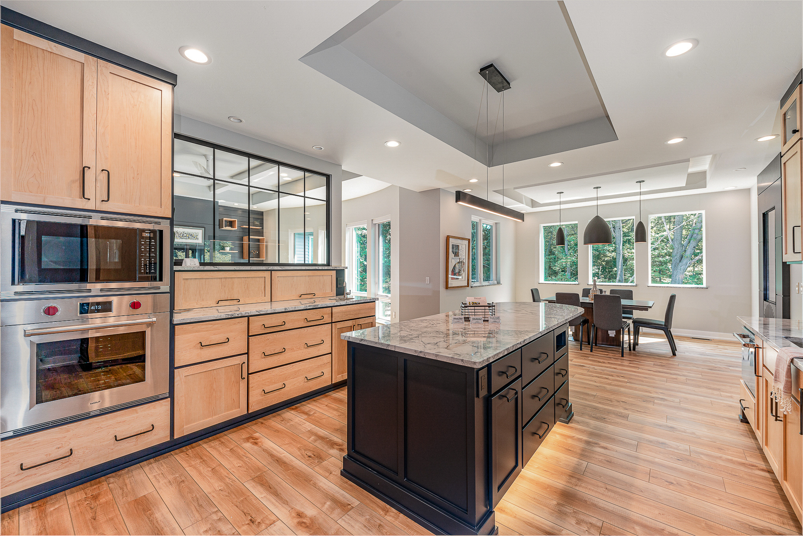 Contemporary design meets tradition with a twist in this custom home. Custom design is exemplified through the one-of-a-kind slat wall system in the great room designed from a scratchpad. The half wall feature in the great room is a nod towards midcentury modern style that compliments its neighbor, the timelessly chic music room. The floating tray ceiling brings the dining room to life accompanied by ambient light. Creative design is blended with technology to offer an automatic waste bin in the kitchen, a Roomba vacuum ‘garage’ in the pantry and automated lights and blinds throughout. Walkway lighting adds to several other features designed for the homeowners to age-in-place. This home exemplifies a collaboration of unique trends and personal touches desired by the homeowners.