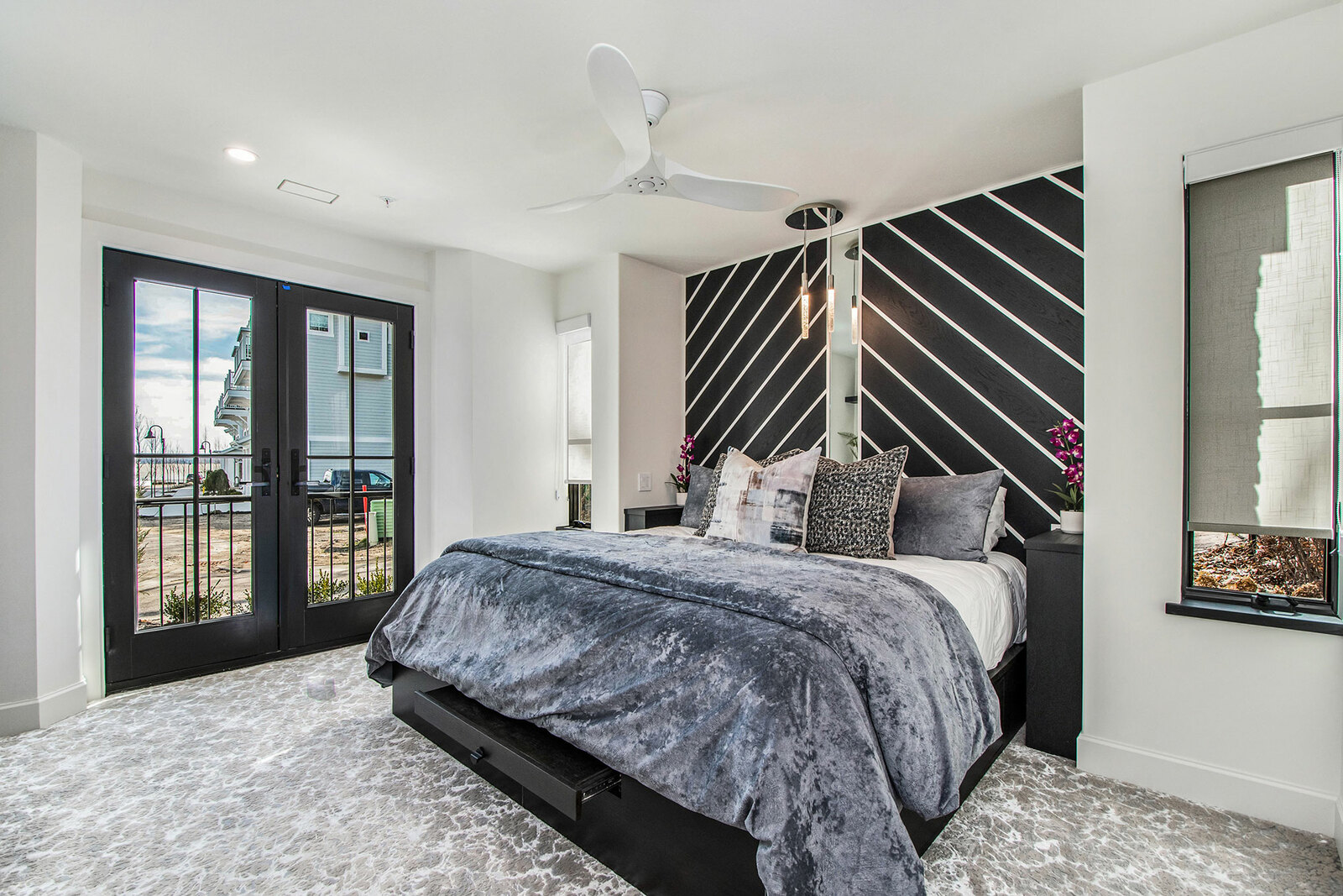 The main level consists of another guest bedroom and the main kitchen / entertaining space. The chevron accent throughout gives the home a flare that is undeniable. The Custom Table/island was handmade that can be converted and moved to expand and fit 12 guests at the minimum. Designed explicitly to be very custom, expandable, and provide ample room to fit everyone and entertain a growing family or special guests.