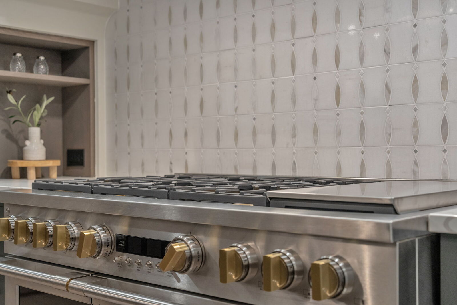 Chef’s kitchen with designer appliances and an oversized island opens to the dining area and family room