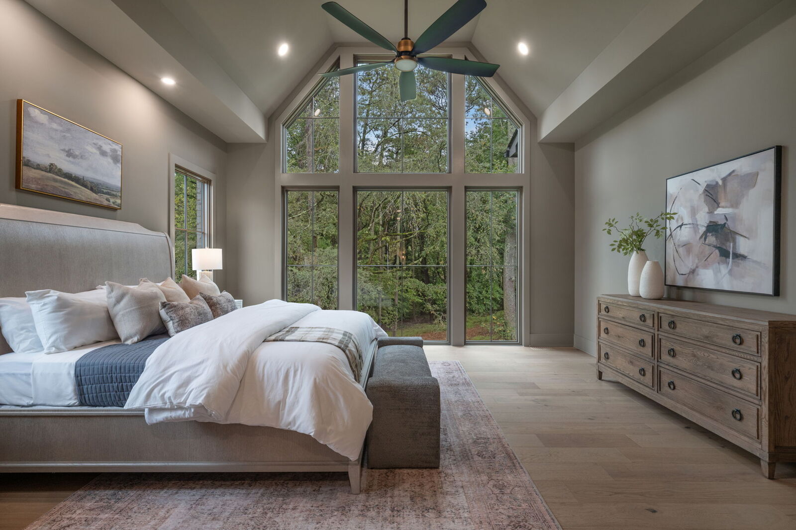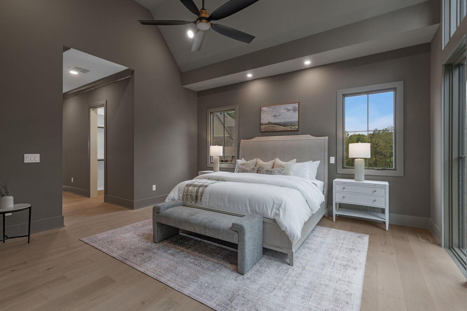 First-floor owner’s suite with freestanding soaking tub, oversized shower, and dual walk-in closets.