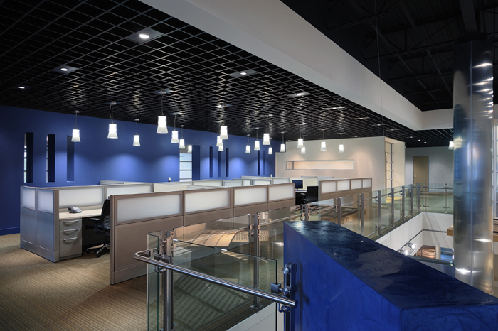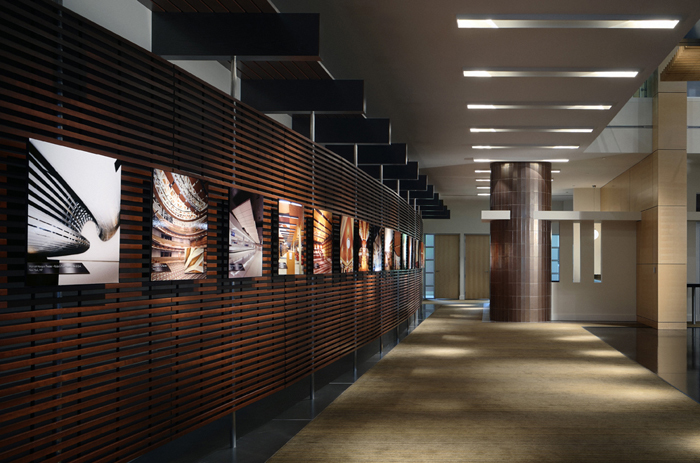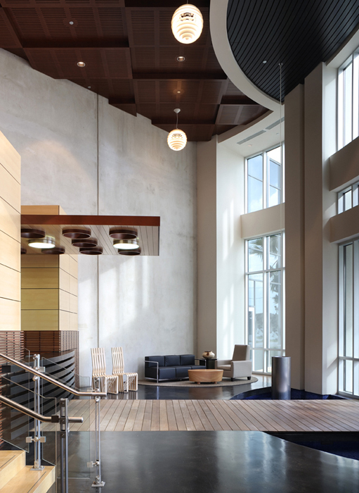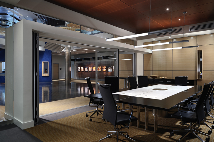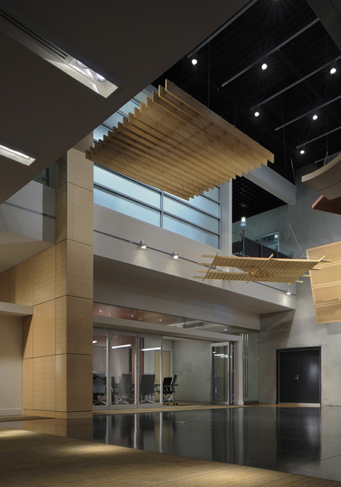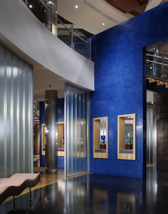 This two-story corporate headquarters consists of 20,000 SF. The clients' architectural wood ceilings serve as a high design showcase. The project consisted of space planning and complete interior design services including lighting design, millwork design, custom detailing, fixture design, furniture and fabric selection, specification and selection of all interior finishes, and consultation for artwork and accessories.