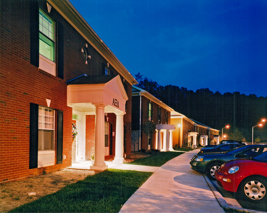 The complex is designed to accommodate fluctuations in chapter size and type and to accommodate future growth in both the number and type of future buildings. With a very restricted budget the Team was able to address a challenging site while providing a high amenity to bed ratio. Amenities in each building include, dedicated chapter rooms, catering kitchens, chapter storage, and semiprivate bath facilities. Each resident suite received individualized mechanical controls and carefully planned construction to enhance sound control between public and private spaces and between the individual suites. Each of the buildings is situated such that parking is localized and plentiful.